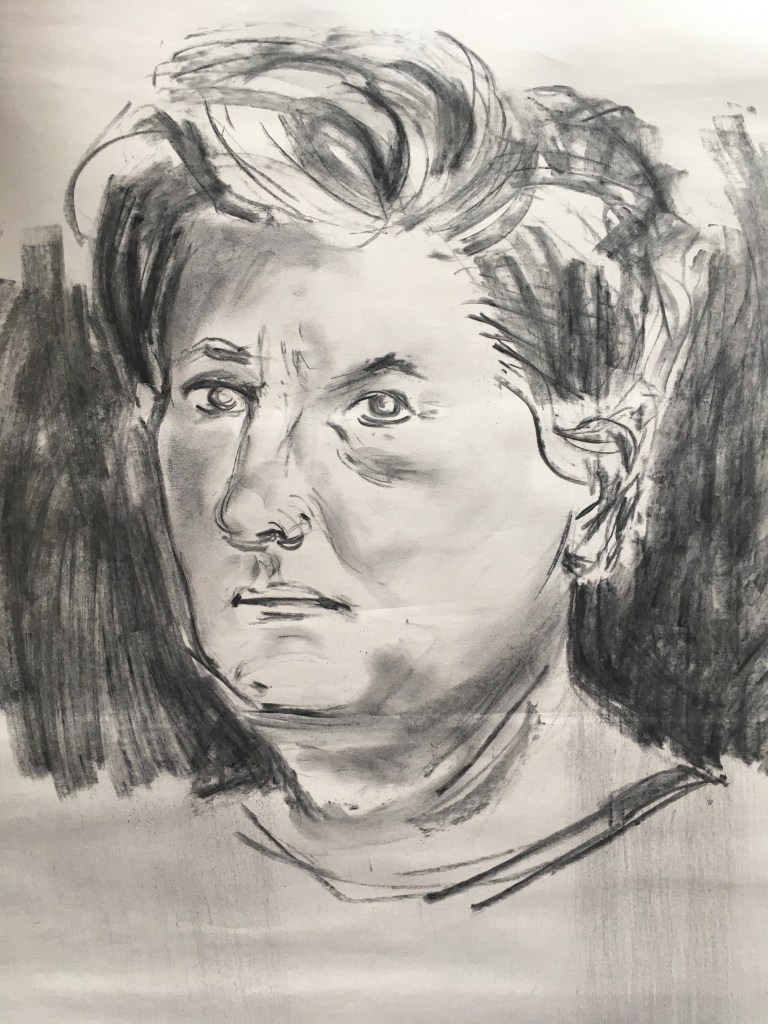 In internal family systems based therapy, I am learning how to identify defenses against pain. I’d guess I’ve had ADHD at least since secondary school, but I was diagnosed at 39. I am conceptualizing the symptoms (time-blindness, executive dysfunction, procrastination, relentless distraction) as some of my defenses against pain, personifying them (what do they look like? how do they sound? how do they feel? how old are they?) as young selves. That sense that I am never prepared enough to start, that I set the stage endlessly for a play that never starts–for some reason I see that part of myself as a clenched fist of coal or ebony. On one hand, soft and smudgy, leaving burnt dust everywhere. On the other, dense, hard, but smooth as a piano key. Both of these materials appeared this week, ebony in the form of a ring M made, and gave me in an spontaneous gesture of kindness. The other, I’ve had since the summer: the jar full of pieces of charcoal I collected from the beach at Lough Dan, leftovers from campers’ fire pits. I can draw with that for a while.