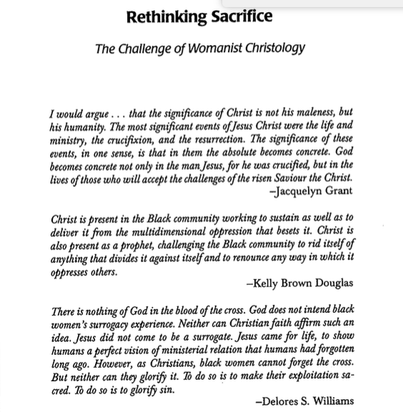 Dr. Terrell talks about religion/ theology organizing the imagination, and I am excited by possibilities to organize imagination toward “enrichment rather than exclusion,” as she says. This does not mean I want to proselytize or apologize for or justify the structures of institutional religion, but maybe I can still be a person in a room (full of people committed to institutional Christianity) who says, “But wait, what about… ?” This is what the women who took the Black Theology of James H. Cone and formed the framework of Womanist Theology did. I make no attempt to teach this material or tell that entire history here, but maybe I/we can begin to unpack a little of what they were doing. This set of quotations is from a chapter in Dr. Terrell’s groundbreaking book, Power in the Blood? The Cross in the African American Experience, first published in 1998.