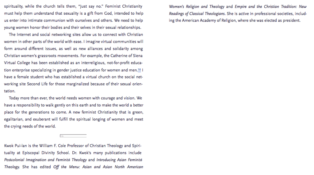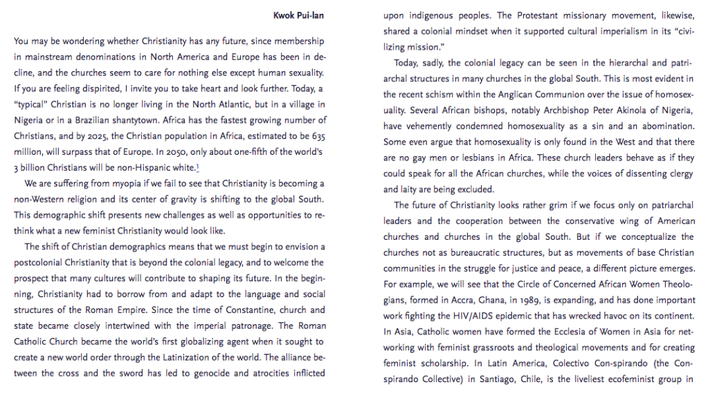 Carmelita M. Usog, DMin (professor of Feminist Theology and Spirituality) quoted by Kwok Pui-lan in her chapter, “A Postcolonial Feminist Vision for Christianity,” in New Feminist Christianity: Many Voices, Many Views, ed. by Mary E. Hunt and Diann L. Neu