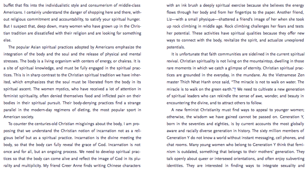 Kwok Pui-lan was born in Hong Kong and is a leading voice on Feminist, Third World and Indigenous Theology/ies. I am interested in the way she describes the engagement with Asian spiritual (and aesthetic) practices in North America, at least in part as a result of dissatisfaction with available spiritual forms. I am interested in the examples she gives of embodied spiritual practices — painting, rock climbing. Her writing is direct, accessible; her sources of authority are other women and their practices, and not only other female theologians, even.