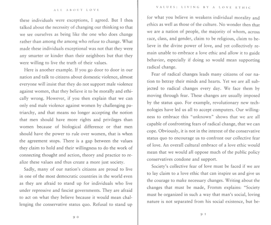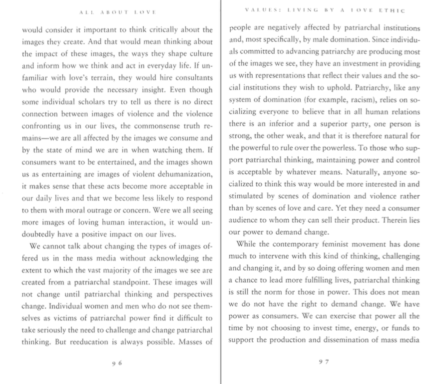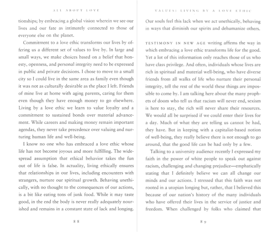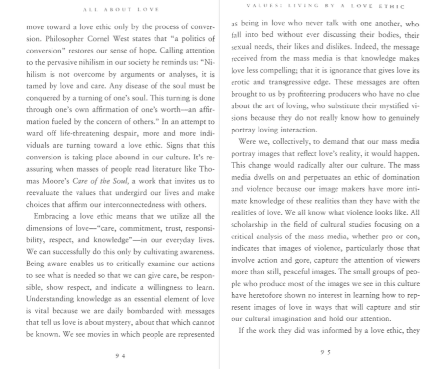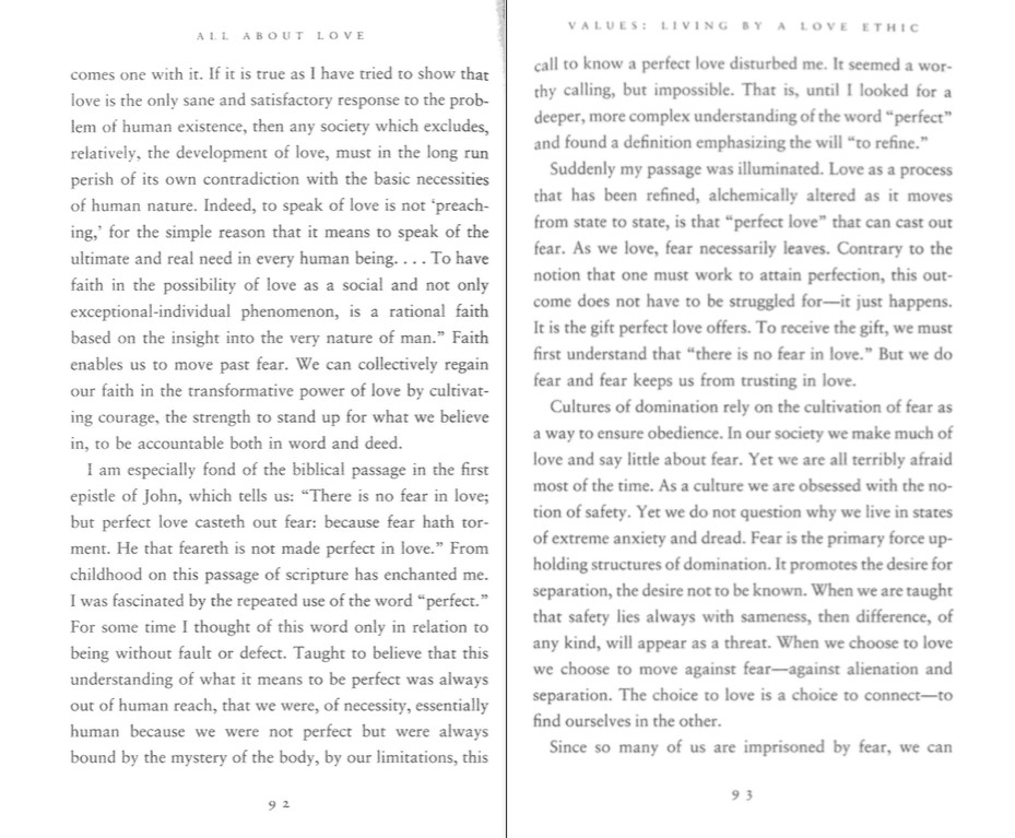 Recently, my sweetheart proposed the idea of reading a text together, and we chose bell hooks’ All About Love: New Visions. I am rereading it, in fact, but I am a different person from the person who first read it. It took me time to give due respect to serious writing that aims to be accessible. One reason for this has to do with my shifting relationship to power. The more I aligned myself to power within the context of white supremacist patriarchy (which I did not, for a long time, recognize), the more I looked for the voices that held (often stole, hoarded) power within that system, and the less likely I was to recognize, much less value, power in the form of a social love ethic.