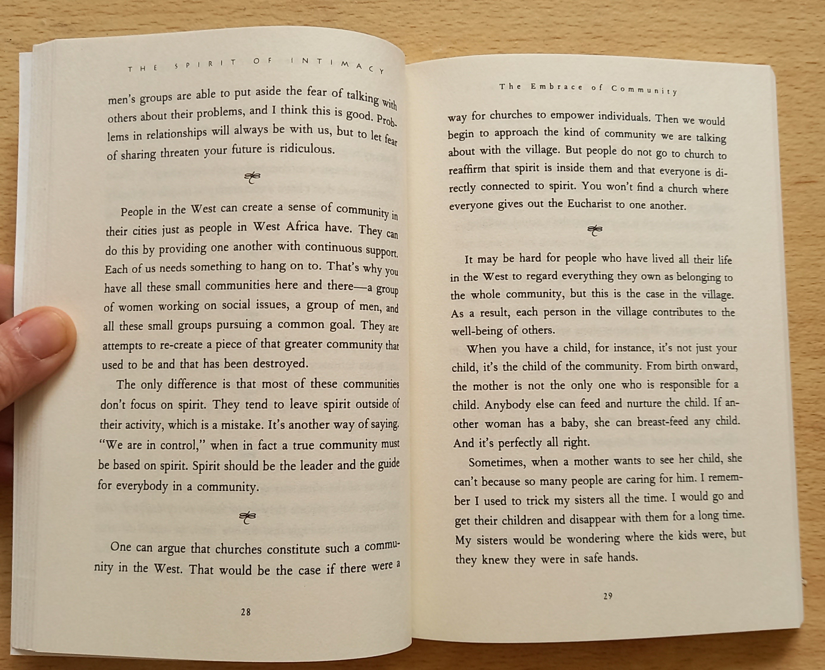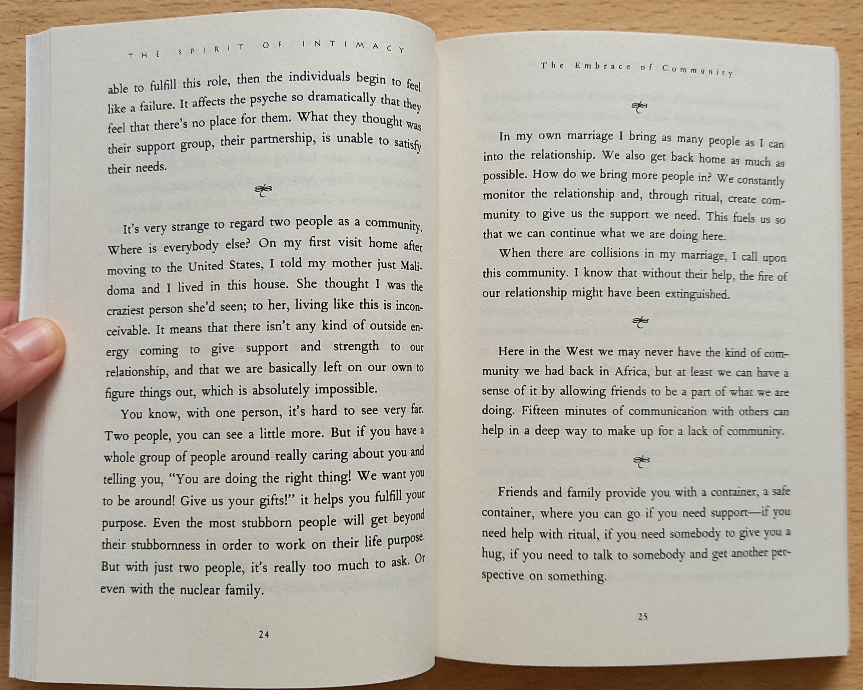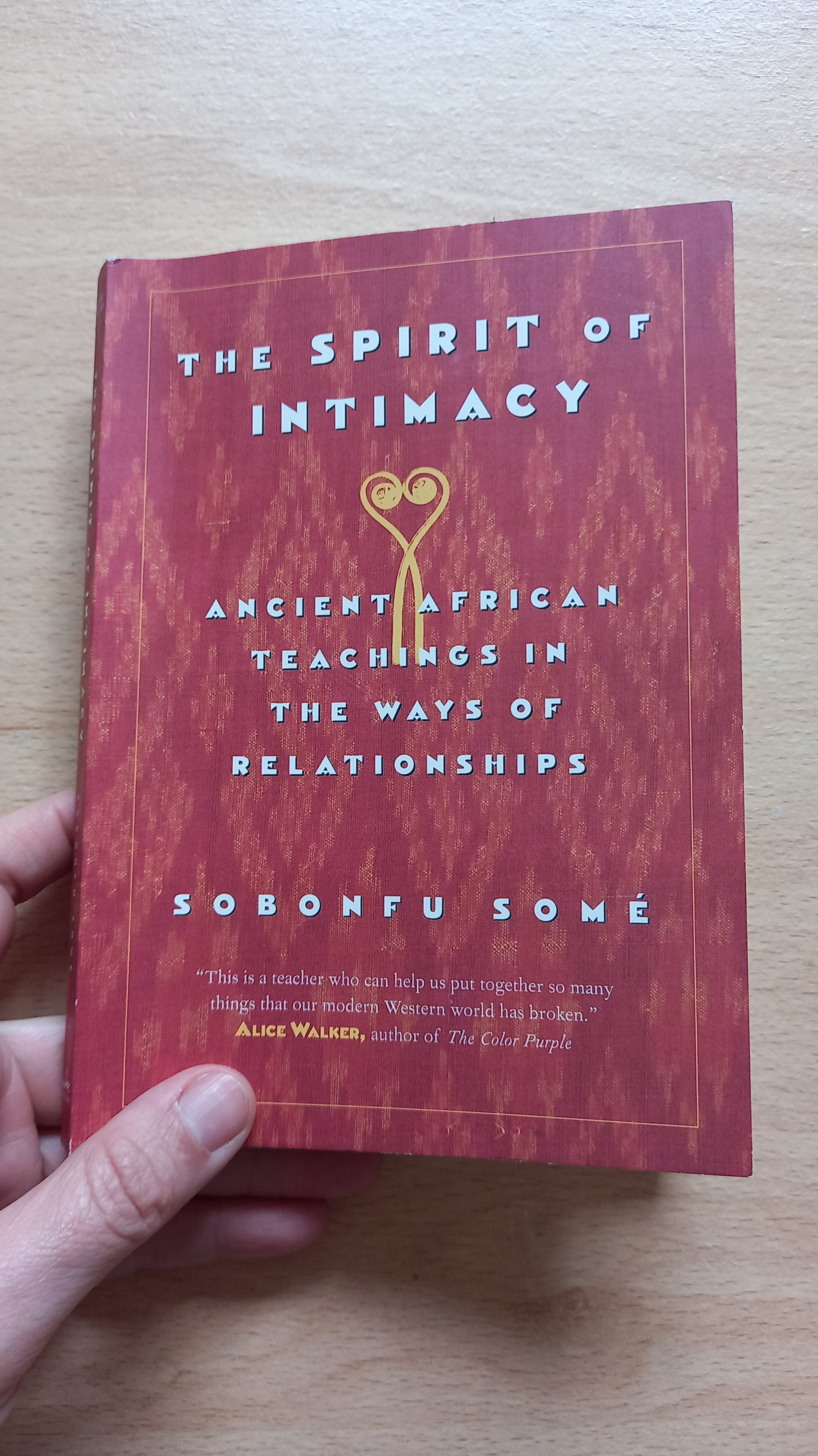 The Spirit of Intimacy, by the late Sobonfu Somé, is a collection of observations, instructions, and insights about community and relationship from the traditions and rituals of the West African Dagara people (of Ghana, Ivory Coast, Togo, Burkina Faso). It is an Indigenous perspective — and I have always wondered why we don’t talk about native African traditions as Indigenous, in the political sense that describes First Nations people in the North Atlantic, for example, or Central and South American Indigenous peoples — in that spirit is considered “the life force of everything,” ancestors circulate among the living, water is life, life is close to the earth, and rituals activate and maintain an awareness of interconnection.