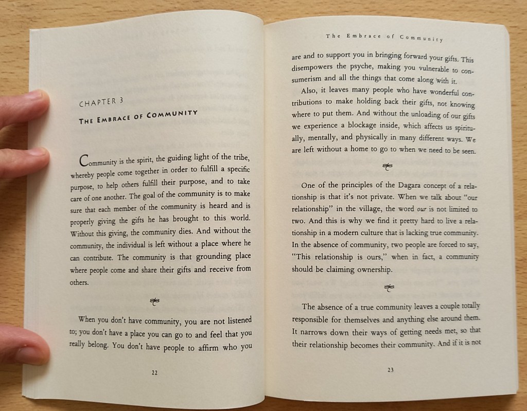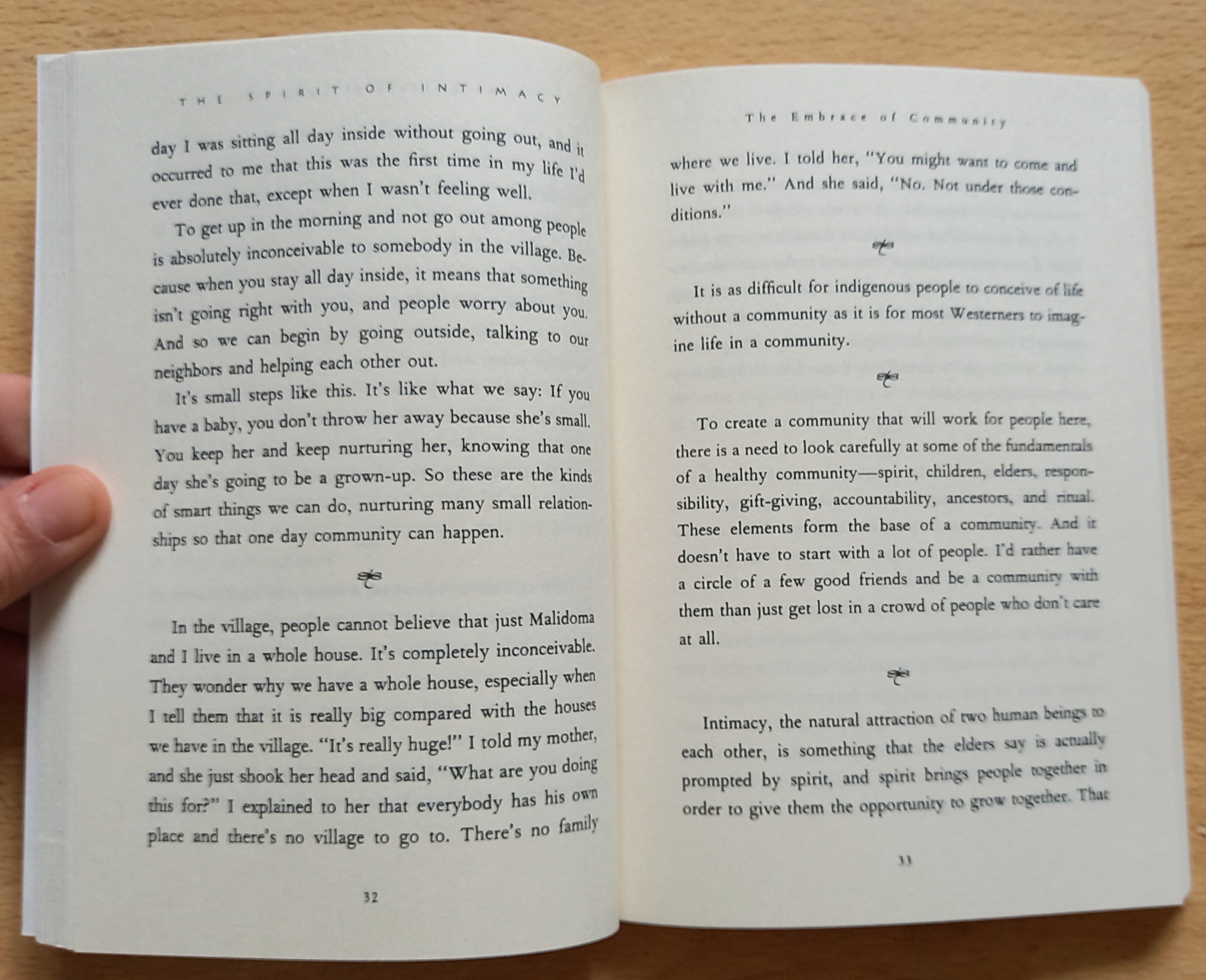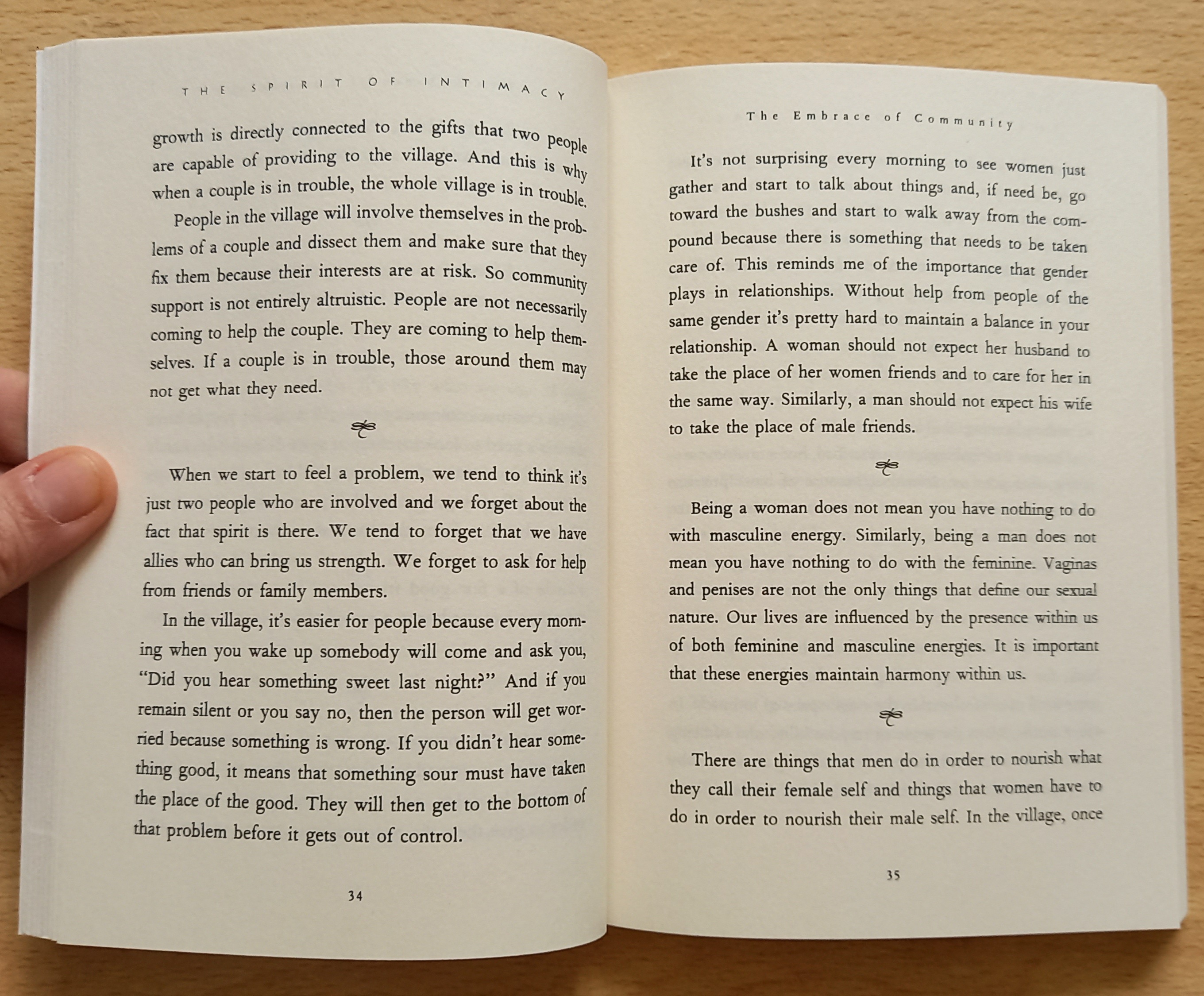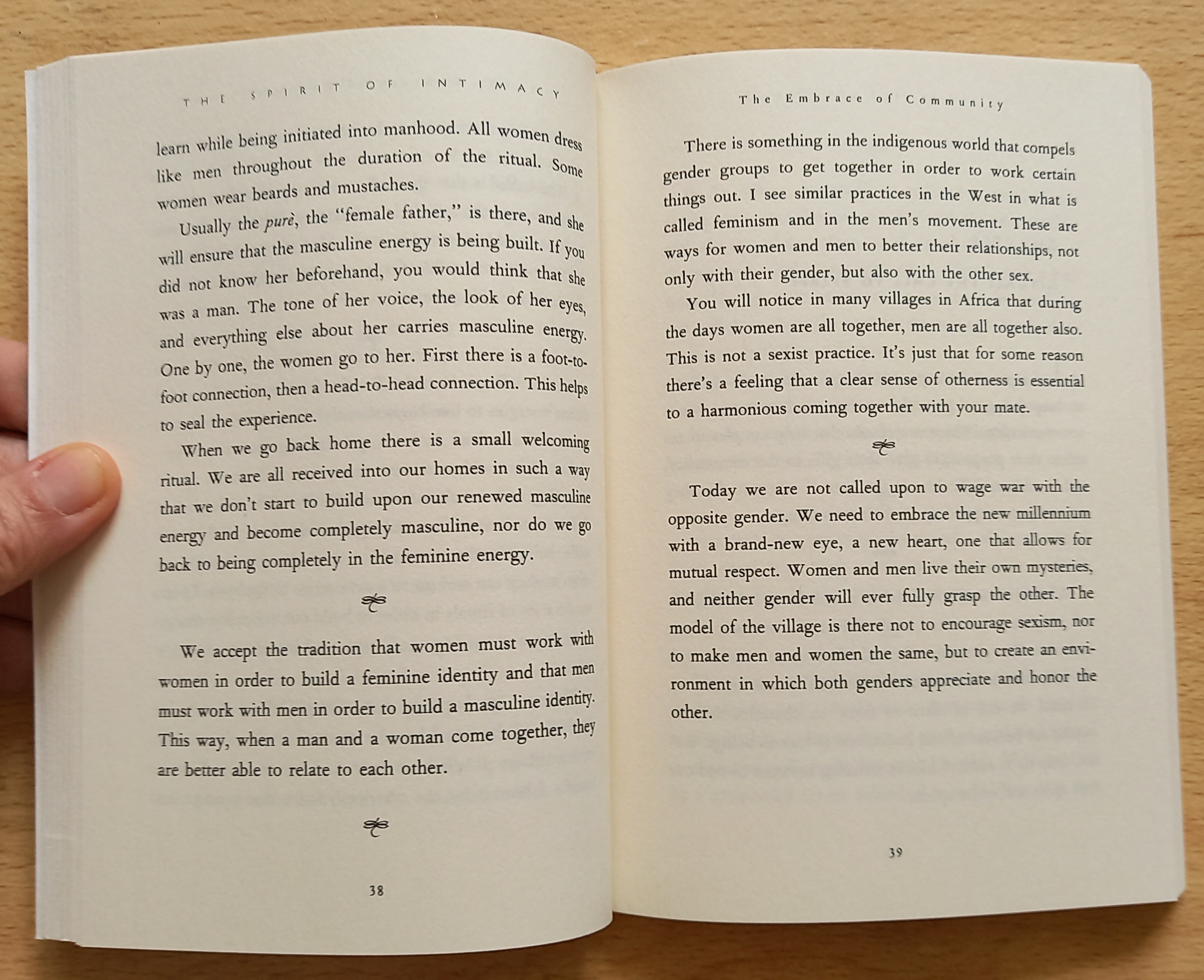 The Spirit of Intimacy, by the late Sobonfu Somé, is a collection of observations, instructions, and insights about community and relationship from the traditions and rituals of the West African Dagara people (of Ghana, Ivory Coast, Togo, Burkina Faso). It is an Indigenous perspective — and I have always wondered why we don’t talk about native African traditions as Indigenous, in the political sense that describes First Nations people in the North Atlantic, for example, or Central and South American Indigenous peoples — in that spirit is considered “the life force of everything,” ancestors circulate among the living, water is life, life is close to the earth, and rituals activate and maintain an awareness of interconnection.