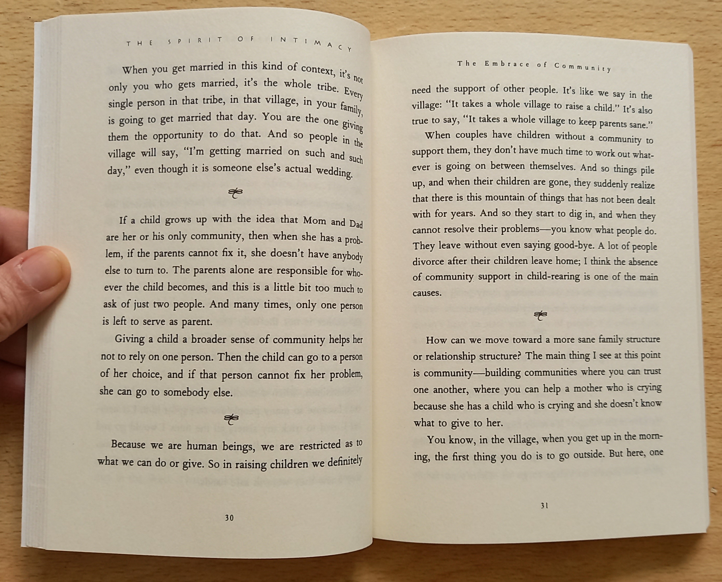 Reading The Spirit of Intimacy, I am both challenged and comforted. So much of what she says resonates more like a remembered knowledge rather than new information. The possibilities of family and village life as she describes them were ruptured long before I was born, so it is no wonder that I found my way to community first by disentangling myself from expectations my culture imposed on my primary family. I first had to structure a self, so I could use its own agency to begin to deconstruct it. I don’t always know what to do with the heteronormative assumptions of many such wisdom texts. Maybe it is yet another reminder that no one has all the truth. Anyway, here is some of it.